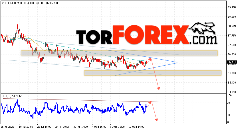 Дополнительным сигнальном в пользу снижения валютной пары EUR/RUB на Форекс выступит тест линии тренда на индикаторе относительной силы. Вторым сигналом станет отскок от верхней границы нисходящего канала. Отменой варианта падения валютной пары EUR/RUB на Форекс 18 августа 2021 станет сильный рост и пробой уровня 87.35 Евро за Рубль. Это укажет на пробой области сопротивления и продолжение подъёма пары Евро Рубль в область выше уровня 90.25. Подтверждением падения валютной пары выступит пробой области поддержки и закрытие котировок инструмента под уровнем 85.25, что укажет на пробой нижней границы модели ”Треугольник”.