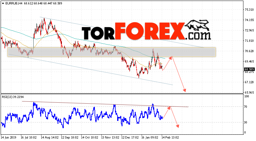 Дополнительным сигнальном в пользу падения валютной пары EUR/RUB на Форекс выступит тест нисходящей линии тренда на индикаторе относительной силы. Вторым сигналом в пользу падения курса европейской валюты станет отскок от верхней границы нисходящего канала. Отменой варианта снижения валютной пары EUR/RUB на Форекс 18 февраля 2020 станет сильный рост и пробой уровня 71.85 Евро за Рубль. Это укажет на пробой области сопротивления и продолжение роста пары Евро Рубль в область выше уровня 73.95. Подтверждением падения валютной пары выступит пробой области поддержки и закрытие котировок инструмента под уровнем 67.25.