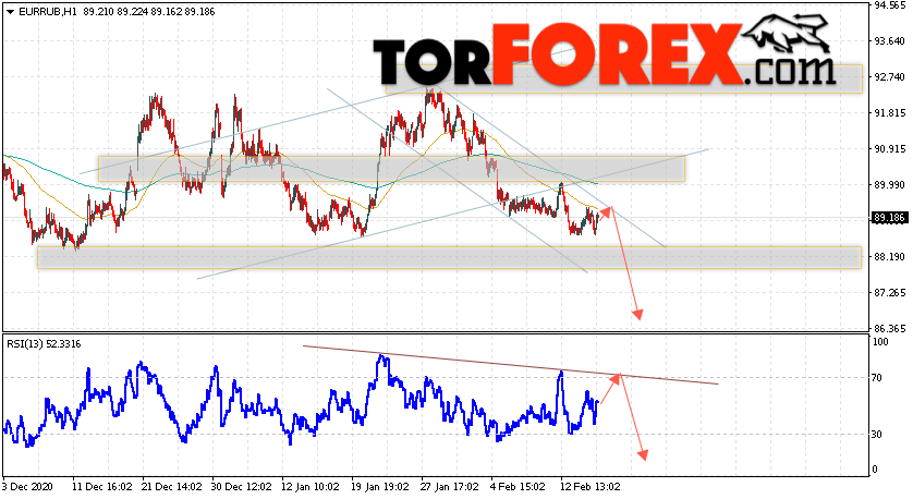 Дополнительным сигнальном в пользу падения валютной пары EUR/RUB на Форекс выступит тест нисходящей линии тренда на индикаторе относительной силы. Вторым сигналом станет отскок от верхней границы нисходящего канала. Отменой варианта падения валютной пары EUR/RUB на Форекс 18 февраля 2021 станет сильный рост и пробой уровня 89.55 Евро за Рубль. Это укажет на пробой области сопротивления и продолжение роста пары Евро Рубль в область выше уровня 93.05. Подтверждением падения валютной пары выступит пробой области поддержки и закрытие котировок инструмента под уровнем 87.85.