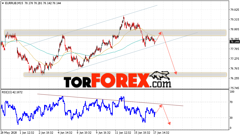 Дополнительным сигнальном в пользу снижения валютной пары EUR/RUB на Форекс выступит тест линии тренда на индикаторе относительной силы. Вторым сигналом станет пробой нижней границы восходящего канала. Отменой варианта падения валютной пары EUR/RUB на Форекс 18 июня 2020 станет сильный рост и пробой уровня 80.25 Евро за Рубль. Это укажет на пробой области сопротивления и продолжение подъёма пары Евро Рубль в область выше уровня 83.25. Подтверждением падения валютной пары выступит пробой области поддержки и закрытие котировок инструмента под уровнем 76.35.