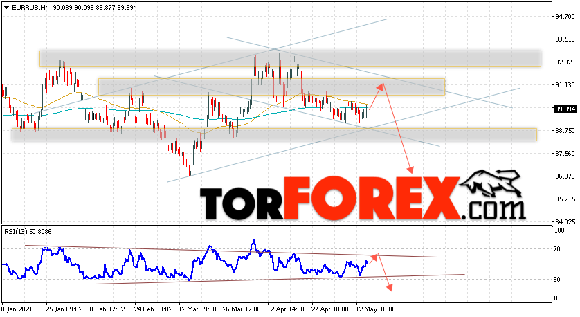 Дополнительным сигнальном в пользу снижения валютной пары EUR/RUB на Форекс выступит тест линии тренда на индикаторе относительной силы. Вторым сигналом станет отскок от области сопротивления. Отменой варианта падения валютной пары EUR/RUB на Форекс 18 мая 2021 станет сильный рост и пробой уровня 92.05 Евро за Рубль. Это укажет на пробой области сопротивления и продолжение подъёма пары Евро Рубль в область выше уровня 94.55. Подтверждением падения валютной пары выступит пробой области поддержки и закрытие котировок инструмента под уровнем 88.45.