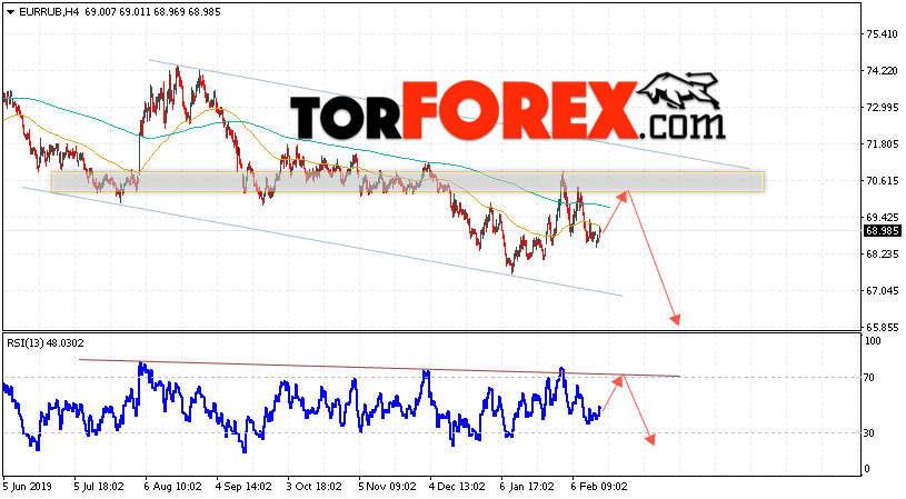 Дополнительным сигнальном в пользу падения валютной пары EUR/RUB на Форекс выступит тест нисходящей линии тренда на индикаторе относительной силы. Вторым сигналом в пользу падения курса европейской валюты станет отскок от верхней границы нисходящего канала. Отменой варианта снижения валютной пары EUR/RUB на Форекс 19 февраля 2020 станет сильный рост и пробой уровня 71.95 Евро за Рубль. Это укажет на пробой области сопротивления и продолжение роста пары Евро Рубль в область выше уровня 74.05. Подтверждением падения валютной пары выступит пробой области поддержки и закрытие котировок инструмента под уровнем 67.75.