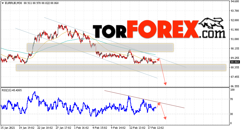 Дополнительным сигнальном в пользу падения валютной пары EUR/RUB на Форекс выступит тест нисходящей линии тренда на индикаторе относительной силы. Вторым сигналом станет отскок от верхней границы нисходящего канала. Отменой варианта падения валютной пары EUR/RUB на Форекс 19 февраля 2021 станет сильный рост и пробой уровня 89.65 Евро за Рубль. Это укажет на пробой области сопротивления и продолжение роста пары Евро Рубль в область выше уровня 93.25. Подтверждением падения валютной пары выступит пробой области поддержки и закрытие котировок инструмента под уровнем 87.75.