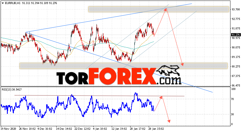 Дополнительным сигнальном в пользу падения валютной пары EUR/RUB на Форекс выступит тест нисходящей линии тренда на индикаторе относительной силы. Вторым сигналом станет отскок от верхней границы ”Волны Вульфа”. Отменой варианта падения валютной пары EUR/RUB на Форекс 2 февраля 2021 станет сильный рост и пробой уровня 95.35 Евро за Рубль. Это укажет на пробой области сопротивления и продолжение подъёма пары Евро Рубль в область выше уровня 97.85. Подтверждением падения валютной пары выступит пробой области поддержки и закрытие котировок инструмента под уровнем 91.00, что укажет на пробой нижней границы восходящего канала.