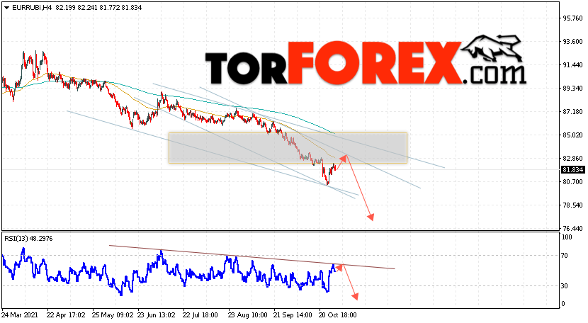 Дополнительным сигнальном в пользу снижения валютной пары EUR/RUB на Форекс выступит тест нисходящей линии тренда на индикаторе относительной силы (RSI). Вторым сигналом станет отскок от верхней границы нисходящего канала. Отменой варианта падения валютной пары EUR/RUB на Форекс 2 ноября 2021 станет сильный рост и пробой уровня 85.45 Евро за Рубль. Это укажет на пробой области сопротивления и продолжение подъёма пары Евро Рубль в область выше уровня 87.65. Подтверждением падения валютной пары выступит пробой области поддержки и закрытие котировок инструмента под уровнем 79.25.