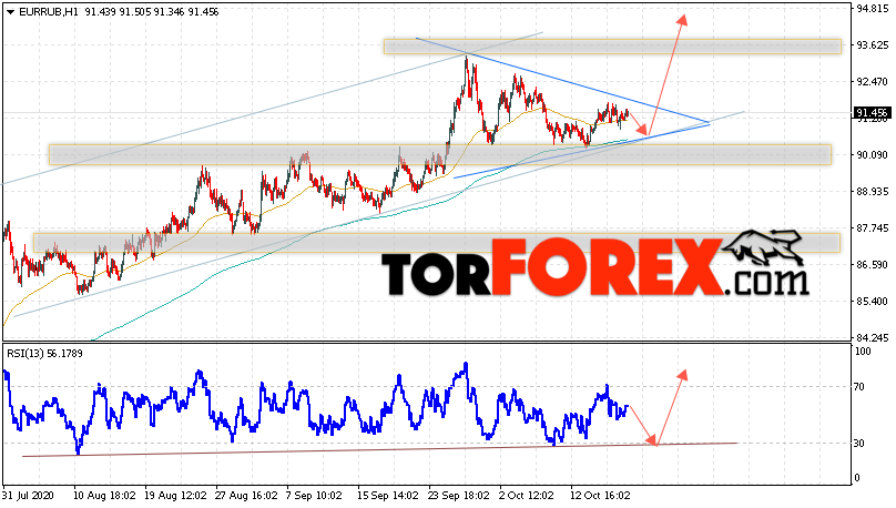 Дополнительным сигнальном в пользу подъёма валютной пары EUR/RUB на Форекс выступит тест восходящей линии тренда на индикаторе относительной силы. Вторым сигналом станет отскок от нижней границы восходящего канала. Отменой варианта подъёма валютной пары EUR/RUB на Форекс 20 октября 2020 станет падение и пробой уровня 89.05 Евро за Рубль. Это укажет на пробой области поддержки и продолжение падения пары Евро Рубль в область ниже уровня 86.55. Подтверждением роста валютной пары выступит пробой области сопротивления и закрытие котировок инструмента над уровнем 92.55, что укажет на пробой верхней границы модели ”Треугольник”.