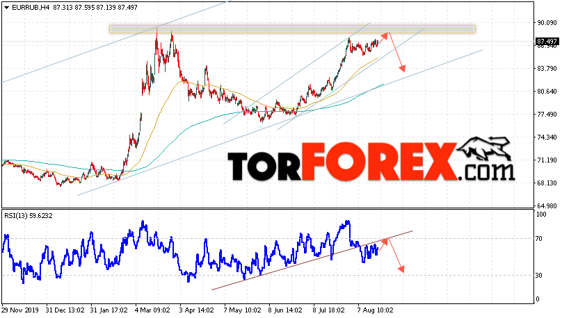 Дополнительным сигнальном в пользу падения валютной пары EUR/RUB на Форекс выступит тест пробитой линии тренда на индикаторе относительной силы. Вторым сигналом станет пробой нижней границы восходящего канала. Отменой варианта падения валютной пары EUR/RUB на Форекс 21 августа 2020 станет сильный рост и пробой уровня 91.45 Евро за Рубль. Это укажет на пробой области сопротивления и продолжение роста пары Евро Рубль в область выше уровня 93.85. Подтверждением падения валютной пары выступит пробой области поддержки и закрытие котировок инструмента под уровнем 84.05.