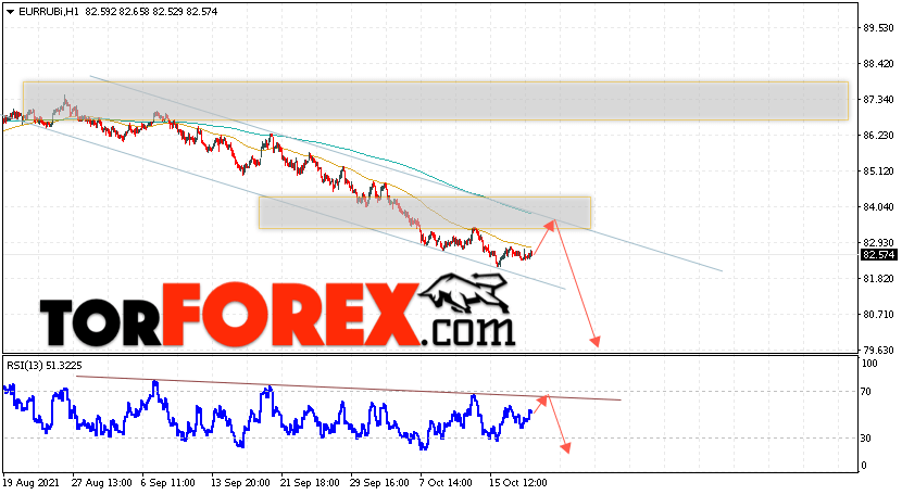 Дополнительным сигнальном в пользу снижения валютной пары EUR/RUB на Форекс выступит тест линии тренда на индикаторе относительной силы. Вторым сигналом станет отскок от верхней границы нисходящего канала. Отменой варианта падения валютной пары EUR/RUB на Форекс 21 октября 2021 станет сильный рост и пробой уровня 84.85 Евро за Рубль. Это укажет на пробой области сопротивления и продолжение подъёма пары Евро Рубль в область выше уровня 86.45. Подтверждением падения валютной пары выступит пробой области поддержки и закрытие котировок инструмента под уровнем 81.45.