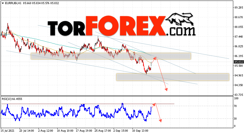 Дополнительным сигнальном в пользу снижения валютной пары EUR/RUB на Форекс выступит тест линии тренда на индикаторе относительной силы. Вторым сигналом станет отскок от верхней границы нисходящего канала. Отменой варианта падения валютной пары EUR/RUB на Форекс 21 сентября 2021 станет сильный рост и пробой уровня 86.65 Евро за Рубль. Это укажет на пробой области сопротивления и продолжение подъёма пары Евро Рубль в область выше уровня 91.75. Подтверждением падения валютной пары выступит пробой области поддержки и закрытие котировок инструмента под уровнем 84.65.