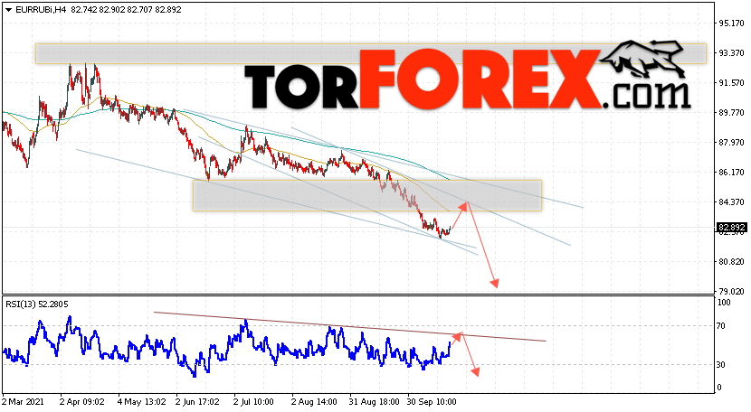 Дополнительным сигнальном в пользу снижения валютной пары EUR/RUB на Форекс выступит тест линии тренда на индикаторе относительной силы. Вторым сигналом станет отскок от верхней границы нисходящего канала. Отменой варианта падения валютной пары EUR/RUB на Форекс 22 октября 2021 станет сильный рост и пробой уровня 85.65 Евро за Рубль. Это укажет на пробой области сопротивления и продолжение подъёма пары Евро Рубль в область выше уровня 88.65. Подтверждением падения валютной пары выступит пробой области поддержки и закрытие котировок инструмента под уровнем 81.85.