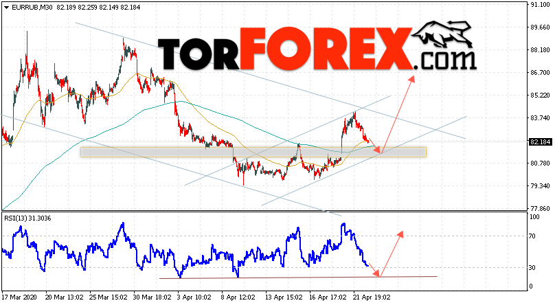 Дополнительным сигнальном в пользу роста валютной пары EUR/RUB на Форекс выступит тест линии тренда на индикаторе относительной силы. Вторым сигналом станет пробой верхней границы нисходящего канала. Отменой варианта роста валютной пары EUR/RUB на Форекс 23 апреля 2020 станет падение и пробой уровня 78.95 Евро за Рубль. Это укажет на пробой области поддержки и продолжение падения пары Евро Рубль в область ниже уровня 69.55. Подтверждением роста валютной пары выступит пробой области сопротивления и закрытие котировок инструмента над уровнем 84.55.