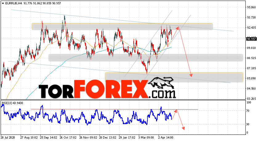 Дополнительным сигнальном в пользу снижения валютной пары EUR/RUB на Форекс выступит тест линии тренда на индикаторе относительной силы. Вторым сигналом станет отскок от верхней границы нисходящего канала. Отменой варианта падения валютной пары EUR/RUB на Форекс 23 апреля 2021 станет сильный рост и пробой уровня 93.65 Евро за Рубль. Это укажет на пробой области сопротивления и продолжение подъёма пары Евро Рубль в область выше уровня 95.65. Подтверждением падения валютной пары выступит пробой области поддержки и закрытие котировок инструмента под уровнем 89.75, что укажет на пробой нижней границы восходящего канала.