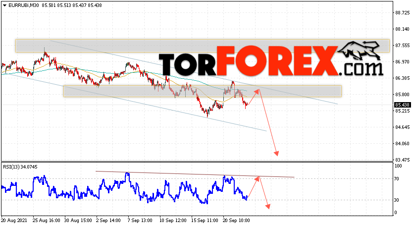 Дополнительным сигнальном в пользу снижения валютной пары EUR/RUB на Форекс выступит тест линии тренда на индикаторе относительной силы. Вторым сигналом станет отскок от верхней границы нисходящего канала. Отменой варианта падения валютной пары EUR/RUB на Форекс 23 сентября 2021 станет сильный рост и пробой уровня 86.95 Евро за Рубль. Это укажет на пробой области сопротивления и продолжение подъёма пары Евро Рубль в область выше уровня 92.55. Подтверждением падения валютной пары выступит пробой области поддержки и закрытие котировок инструмента под уровнем 84.65.
