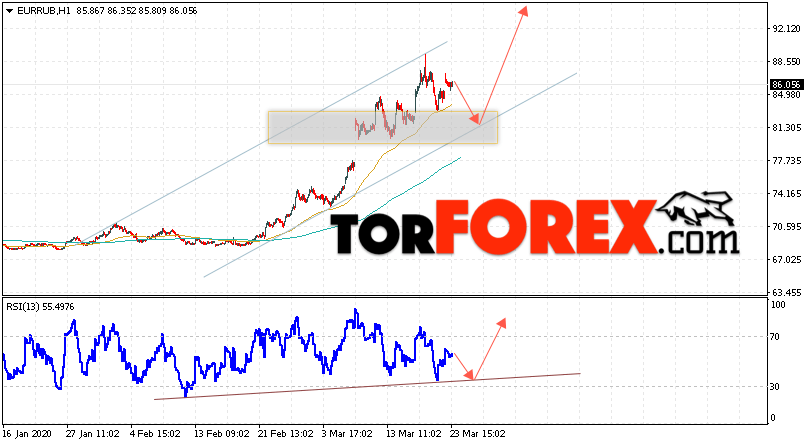 Дополнительным сигнальном в пользу подъёма валютной пары EUR/RUB на Форекс выступит тест восходящей линии тренда на индикаторе относительной силы. Вторым сигналом в пользу роста станет отскок от нижней границы восходящего канала. Отменой варианта роста валютной пары EUR/RUB на Форекс 24 марта 2020 станет падение и пробой уровня 79.95 Евро за Рубль. Это укажет на пробой области поддержки и продолжение падения пары Евро Рубль в область ниже уровня 75.65. Подтверждением роста валютной пары выступит пробой области сопротивления и закрытие котировок инструмента над уровнем 90.05.
