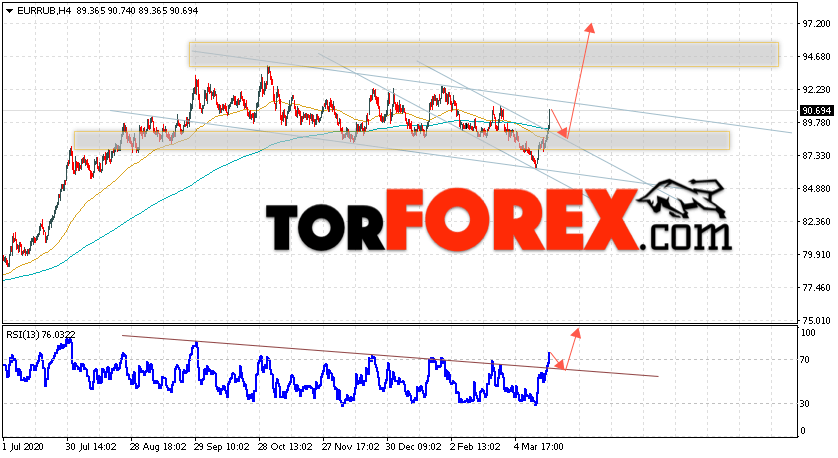Дополнительным сигнальном в пользу роста валютной пары EUR/RUB на Форекс выступит тест нисходящей линии тренда на индикаторе относительной силы. Вторым сигналом станет отскок от верхней нисходящего канала. Отменой варианта подъёма валютной пары EUR/RUB на Форекс 24 марта 2021 станет падение и пробой уровня 84.75 Евро за Рубль. Это укажет на пробой области поддержки и продолжение падения пары Евро Рубль в область ниже уровня 82.25. Подтверждением подъёма валютной пары выступит пробой области сопротивления и закрытие котировок инструмента над уровнем 92.35.