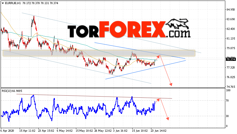 Дополнительным сигнальном в пользу снижения валютной пары EUR/RUB на Форекс выступит тест линии тренда на индикаторе относительной силы. Вторым сигналом станет отскок от верхней границы нисходящего канала. Отменой варианта падения валютной пары EUR/RUB на Форекс 25 июня 2020 станет сильный рост и пробой уровня 81.25 Евро за Рубль. Это укажет на пробой области сопротивления и продолжение подъёма пары Евро Рубль в область выше уровня 84.55. Подтверждением падения валютной пары выступит пробой области поддержки и закрытие котировок инструмента под уровнем 76.05.