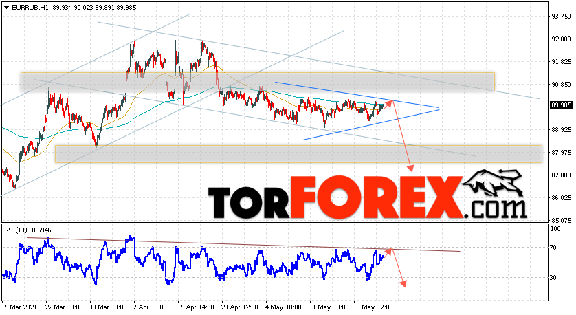 Дополнительным сигнальном в пользу снижения валютной пары EUR/RUB на Форекс выступит тест линии тренда на индикаторе относительной силы. Вторым сигналом станет отскок от верхней границы модели ”Треугольник”. Отменой варианта падения валютной пары EUR/RUB на Форекс 26 мая 2021 станет сильный рост и пробой уровня 90.85 Евро за Рубль. Это укажет на пробой области сопротивления и продолжение подъёма пары Евро Рубль в область выше уровня 94.65. Подтверждением падения валютной пары выступит пробой области поддержки и закрытие котировок инструмента под уровнем 88.65.