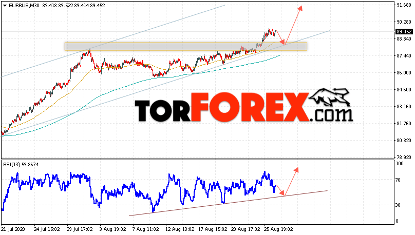 Дополнительным сигнальном в пользу подъёма валютной пары EUR/RUB на Форекс выступит тест восходящей линии тренда на индикаторе относительной силы. Вторым сигналом станет пробой нижней границы восходящего канала. Отменой варианта роста валютной пары EUR/RUB на Форекс 27 августа 2020 станет падение и пробой уровня 85.95 Евро за Рубль. Это укажет на пробой области поддержки и продолжение падения пары Евро Рубль в область ниже уровня 84.25. Подтверждением подъёма валютной пары выступит пробой области сопротивления и закрытие котировок инструмента над уровнем 90.65.