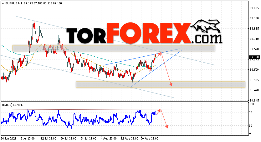 Дополнительным сигнальном в пользу снижения валютной пары EUR/RUB на Форекс выступит тест линии тренда на индикаторе относительной силы. Вторым сигналом станет отскок от верхней границы модели ”Клин”. Отменой варианта падения валютной пары EUR/RUB на Форекс 27 августа 2021 станет сильный рост и пробой уровня 88.15 Евро за Рубль. Это укажет на пробой области сопротивления и продолжение подъёма пары Евро Рубль в область выше уровня 92.25. Подтверждением падения валютной пары выступит пробой области поддержки и закрытие котировок инструмента под уровнем 86.05, что укажет на пробой нижней границы модели ”Клин”.