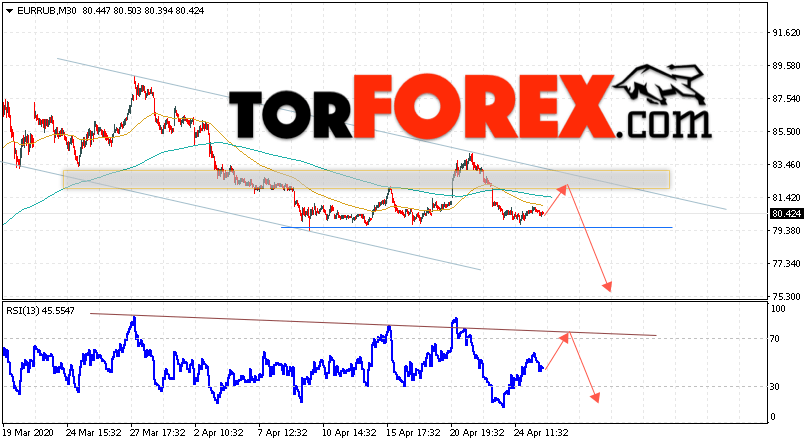 Дополнительным сигнальном в пользу снижения валютной пары EUR/RUB на Форекс выступит тест линии тренда на индикаторе относительной силы. Вторым сигналом станет отскок от верхней границы нисходящего канала. Отменой варианта падения валютной пары EUR/RUB на Форекс 28 апреля 2020 станет сильный рост и пробой уровня 85.50 Евро за Рубль. Это укажет на пробой области сопротивления и продолжение подъёма пары Евро Рубль в область выше уровня 87.65. Подтверждением падения валютной пары выступит пробой области поддержки и закрытие котировок инструмента под уровнем 79.05.