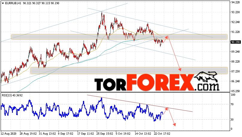 Дополнительным сигнальном в пользу падения валютной пары EUR/RUB на Форекс выступит тест нисходящей линии тренда на индикаторе относительной силы. Вторым сигналом станет отскок от верхней границы нисходящего канала. Отменой варианта падения валютной пары EUR/RUB на Форекс 28 октября 2020 станет сильный рост и пробой уровня 92.25 Евро за Рубль. Это укажет на пробой области сопротивления и продолжение роста пары Евро Рубль в область выше уровня 94.75. Подтверждением падения валютной пары выступит пробой области поддержки и закрытие котировок инструмента под уровнем 89.25.