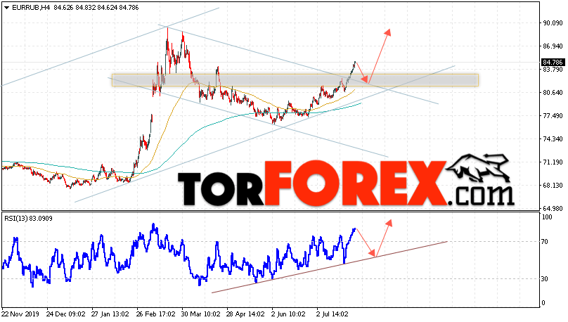Дополнительным сигнальном в пользу подъёма валютной пары EUR/RUB на Форекс выступит тест линии тренда на индикаторе относительной силы. Вторым сигналом станет отскок от верхней границы нисходящего канала. Отменой варианта роста валютной пары EUR/RUB на Форекс 29 июля 2020 станет падение и пробой уровня 79.05 Евро за Рубль. Это укажет на пробой области поддержки и продолжение падения пары Евро Рубль в область ниже уровня 76.15. Подтверждением роста валютной пары выступит пробой области сопротивления и закрытие котировок инструмента над уровнем 86.85.