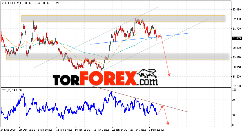 Дополнительным сигнальном в пользу падения валютной пары EUR/RUB на Форекс выступит тест нисходящей линии тренда на индикаторе относительной силы. Вторым сигналом станет завершение формирования разворотной модели ”Голова и плечи”. Отменой варианта падения валютной пары EUR/RUB на Форекс 3 февраля 2021 станет сильный рост и пробой уровня 95.05 Евро за Рубль. Это укажет на пробой области сопротивления и продолжение подъёма пары Евро Рубль в область выше уровня 96.55. Подтверждением падения валютной пары выступит пробой области поддержки и закрытие котировок инструмента под уровнем 90.55, что укажет на пробой нижней границы восходящего канала.