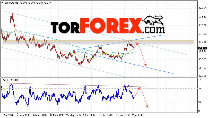 Дополнительным сигнальном в пользу снижения валютной пары EUR/RUB на Форекс выступит тест линии тренда на индикаторе относительной силы. Вторым сигналом станет отскок от верхней границы модели «Волна Вульфа». Отменой варианта падения валютной пары EUR/RUB на Форекс 3 июля 2020 станет сильный рост и пробой уровня 82.25 Евро за Рубль. Это укажет на пробой области сопротивления и продолжение подъёма пары Евро Рубль в область выше уровня 85.05, в этом случае не стоит ожидать отработку разворотной модели. Подтверждением падения валютной пары выступит пробой области поддержки и закрытие котировок инструмента под уровнем 78.85.