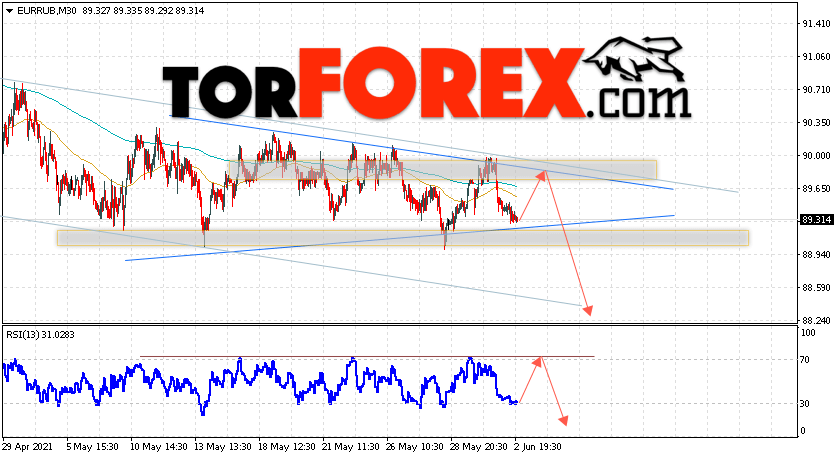 Дополнительным сигнальном в пользу снижения валютной пары EUR/RUB на Форекс выступит тест линии тренда на индикаторе относительной силы. Вторым сигналом станет отскок от верхней границы модели ”Треугольник”. Отменой варианта падения валютной пары EUR/RUB на Форекс 3 июня 2021 станет сильный рост и пробой уровня 90.45 Евро за Рубль. Это укажет на пробой области сопротивления и продолжение подъёма пары Евро Рубль в область выше уровня 93.05. Подтверждением падения валютной пары выступит пробой области поддержки и закрытие котировок инструмента под уровнем 88.55.