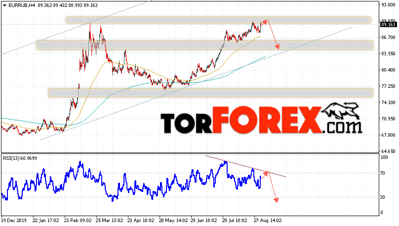 Дополнительным сигнальном в пользу падения валютной пары EUR/RUB на Форекс выступит тест нисходящей линии тренда на индикаторе относительной силы. Вторым сигналом станет пробой нижней границы восходящего канала. Отменой варианта падения валютной пары EUR/RUB на Форекс 3 сентября 2020 станет сильный рост и пробой уровня 92.55 Евро за Рубль. Это укажет на пробой области сопротивления и продолжение роста пары Евро Рубль в область выше уровня 95.85. Подтверждением падения валютной пары выступит пробой области поддержки и закрытие котировок инструмента под уровнем 85.75.