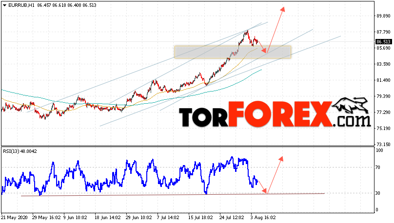 Дополнительным сигнальном в пользу подъёма валютной пары EUR/RUB на Форекс выступит тест линии тренда на индикаторе относительной силы. Вторым сигналом станет отскок от верхней границы восходящего канала. Отменой варианта роста валютной пары EUR/RUB на Форекс 5 августа 2020 станет падение и пробой уровня 82.05 Евро за Рубль. Это укажет на пробой области поддержки и продолжение падения пары Евро Рубль в область ниже уровня 78.65. Подтверждением роста валютной пары выступит пробой области сопротивления и закрытие котировок инструмента над уровнем 89.05.