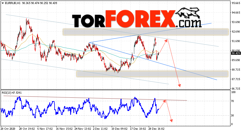 Дополнительным сигнальном в пользу падения валютной пары EUR/RUB на Форекс выступит тест нисходящей линии тренда на индикаторе относительной силы. Вторым сигналом станет отскок от верхней границы модели ”Волна Вульфа”. Отменой варианта падения валютной пары EUR/RUB на Форекс 5 января 2021 станет сильный рост и пробой уровня 93.95 Евро за Рубль. Это укажет на пробой области сопротивления и продолжение подъёма пары Евро Рубль в область выше уровня 96.75. Подтверждением падения валютной пары выступит пробой области поддержки и закрытие котировок инструмента под уровнем 88.75.