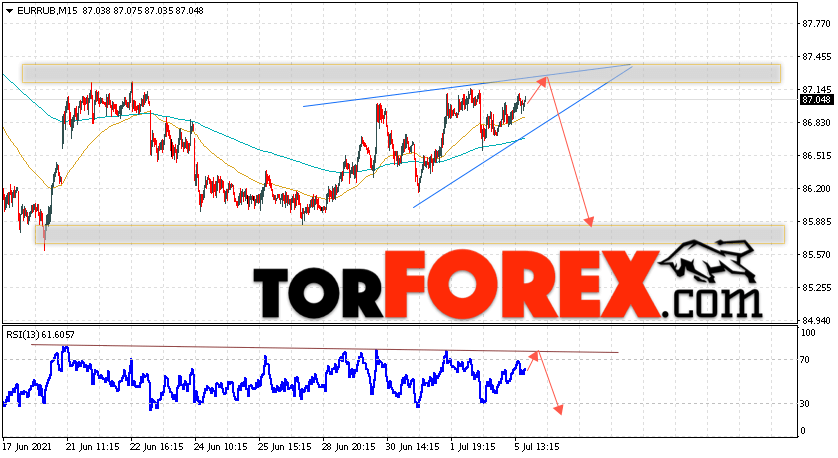 Дополнительным сигнальном в пользу снижения валютной пары EUR/RUB на Форекс выступит тест линии тренда на индикаторе относительной силы. Вторым сигналом станет отскок от верхней границы модели ”Клин”. Отменой варианта падения валютной пары EUR/RUB на Форекс 6 июля 2021 станет сильный рост и пробой уровня 88.05 Евро за Рубль. Это укажет на пробой области сопротивления и продолжение подъёма пары Евро Рубль в область выше уровня 92.45. Подтверждением падения валютной пары выступит пробой области поддержки и закрытие котировок инструмента под уровнем 85.45, что укажет на пробой нижней границы модели ”Клин”.