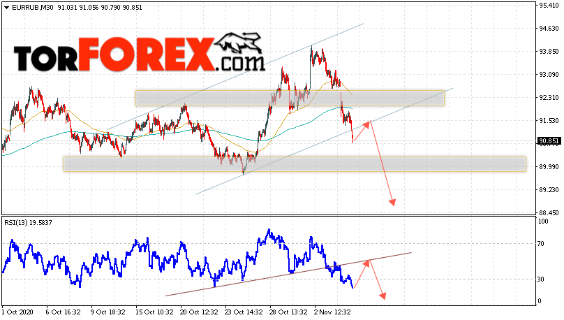Дополнительным сигнальном в пользу падения валютной пары EUR/RUB на Форекс выступит тест пробитой линии тренда на индикаторе относительной силы. Вторым сигналом станет отскок от нижней границы восходящего канала. Отменой варианта падения валютной пары EUR/RUB на Форекс 6 ноября 2020 станет сильный рост и пробой уровня 93.55 Евро за Рубль. Это укажет на пробой области сопротивления и продолжение роста пары Евро Рубль в область выше уровня 95.65. Подтверждением падения валютной пары выступит пробой области поддержки и закрытие котировок инструмента под уровнем 89.65.