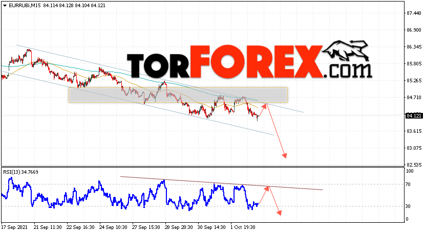 Дополнительным сигнальном в пользу снижения валютной пары EUR/RUB на Форекс выступит тест линии тренда на индикаторе относительной силы. Вторым сигналом станет отскок от верхней границы нисходящего канала. Отменой варианта падения валютной пары EUR/RUB на Форекс 6 октября 2021 станет сильный рост и пробой уровня 85.25 Евро за Рубль. Это укажет на пробой области сопротивления и продолжение подъёма пары Евро Рубль в область выше уровня 87.45. Подтверждением падения валютной пары выступит пробой области поддержки и закрытие котировок инструмента под уровнем 83.05.
