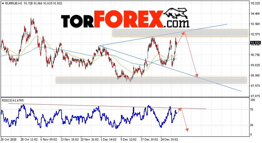 Дополнительным сигнальном в пользу падения валютной пары EUR/RUB на Форекс выступит тест нисходящей линии тренда на индикаторе относительной силы. Вторым сигналом станет отскок от верхней границы модели ”Волна Вульфа”. Отменой варианта падения валютной пары EUR/RUB на Форекс 6 января 2021 станет сильный рост и пробой уровня 94.05 Евро за Рубль. Это укажет на пробой области сопротивления и продолжение подъёма пары Евро Рубль в область выше уровня 96.65. Подтверждением падения валютной пары выступит пробой области поддержки и закрытие котировок инструмента под уровнем 90.75.