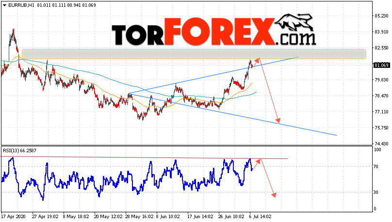 Дополнительным сигнальном в пользу снижения валютной пары EUR/RUB на Форекс выступит тест линии тренда на индикаторе относительной силы. Вторым сигналом станет отскок от верхней границы модели «Волна Вульфа». Отменой варианта падения валютной пары EUR/RUB на Форекс 7 июля 2020 станет сильный рост и пробой уровня 82.95 Евро за Рубль. Это укажет на пробой области сопротивления и продолжение подъёма пары Евро Рубль в область выше уровня 86.55, в этом случае не стоит ожидать отработку разворотной модели. Подтверждением падения валютной пары выступит пробой области поддержки и закрытие котировок инструмента под уровнем 78.85.