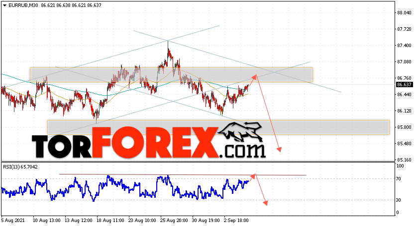 Дополнительным сигнальном в пользу снижения валютной пары EUR/RUB на Форекс выступит тест линии тренда на индикаторе относительной силы. Вторым сигналом станет отскок от верхней границы нисходящего канала. Отменой варианта падения валютной пары EUR/RUB на Форекс 7 сентября 2021 станет сильный рост и пробой уровня 87.55 Евро за Рубль. Это укажет на пробой области сопротивления и продолжение подъёма пары Евро Рубль в область выше уровня 92.45. Подтверждением падения валютной пары выступит пробой области поддержки и закрытие котировок инструмента под уровнем 85.55.