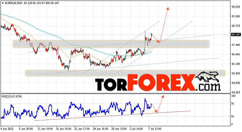Дополнительным сигнальном в пользу подъёма валютной пары EUR/RUB на Форекс выступит тест линии тренда на индикаторе относительной силы. Вторым сигналом станет отскок от нижней границы бычьего канала. Отменой варианта роста валютной пары EUR/RUB на Форекс 8 июля 2021 станет падение и пробой уровня 86.95 Евро за Рубль. Это укажет на пробой области поддержки и продолжение падения пары Евро Рубль в область ниже уровня 84.95. Подтверждением подъёма валютной пары выступит пробой области сопротивления и закрытие котировок инструмента над уровнем 90.05.