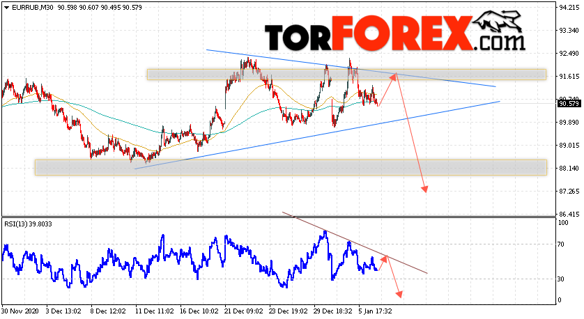 Дополнительным сигнальном в пользу падения валютной пары EUR/RUB на Форекс выступит тест нисходящей линии тренда на индикаторе относительной силы. Вторым сигналом станет отскок от верхней границы модели ”Треугольник”. Отменой варианта падения валютной пары EUR/RUB на Форекс 8 января 2021 станет сильный рост и пробой уровня 93.05 Евро за Рубль. Это укажет на пробой области сопротивления и продолжение подъёма пары Евро Рубль в область выше уровня 95.65. Подтверждением падения валютной пары выступит пробой области поддержки и закрытие котировок инструмента под уровнем 89.05, что укажет на пробой нижней границы модели ”Треугольник”.