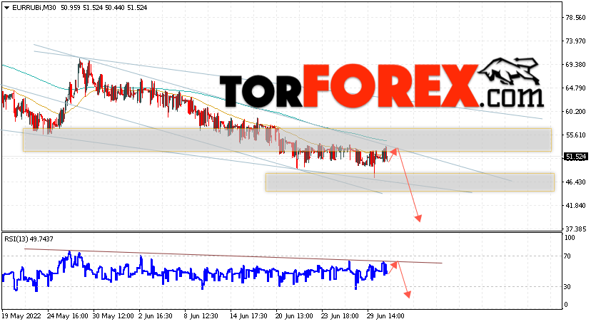 Дополнительным сигнальном в пользу падения валютной пары EUR/RUB на Форекс выступит тест линии линии сопротивления на индикаторе относительной силы (RSI). Вторым сигналом станет отскок от верхней границы медвежьего канала. Отменой варианта падения валютной пары EUR/RUB на Форекс 1 июля 2022 станет сильный рост и пробой уровня 56.45 Евро за Рубль. Это укажет на пробой области сопротивления и продолжение подъёма пары Евро Рубль в область выше уровня 59.95. Подтверждением падению валютной пары выступит пробой области поддержки и закрытие котировок инструмента ниже уровня 44.05, что укажет на пробой нижней границы нисходящего канала.