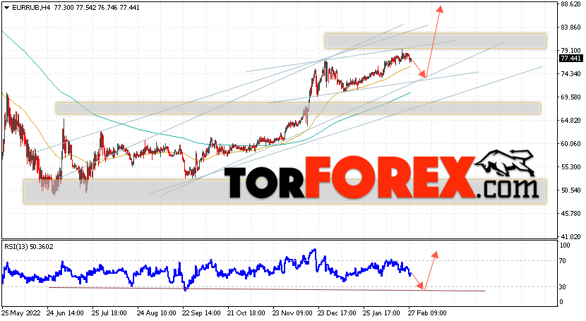 Дополнительным сигнальном в пользу подъёма валютной пары EUR/RUB на Форекс выступит тест линии линии поддержки на индикаторе относительной силы (RSI). Вторым сигналом станет отскок от нижней границы бычьего канала. Отменой варианта роста валютной пары EUR/RUB на Форекс 1 марта 2023 станет падение и пробой уровня 70.05 Евро за Рубль. Это укажет на пробой области поддержки и продолжение снижения пары Евро Рубль в область ниже уровня 66.45. Подтверждением росту валютной пары выступит пробой области сопротивления и закрытие котировок инструмента выше уровня 83.55, что укажет на пробой верхней границы бычьего канала, а это сигнал к росту на ширину канала.