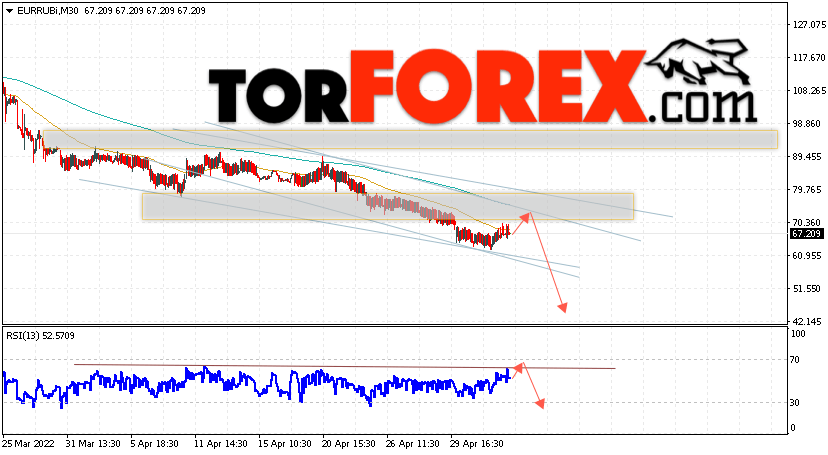 Дополнительным сигнальном в пользу падения валютной пары EUR/RUB на Форекс выступит тест линии сопротивления на индикаторе относительной силы (RSI). Вторым сигналом станет отскок от верхней границы медвежьего канала. Отменой варианта падения валютной пары EUR/RUB на Форекс 10 мая 2022 станет сильный рост и пробой уровня 82.05 Евро за Рубль. Это укажет на пробой области сопротивления и продолжение роста пары Евро Рубль в область выше уровня 90.05. Подтверждением падению валютной пары выступит пробой области поддержки и закрытие котировок инструмента под уровнем 56.55.