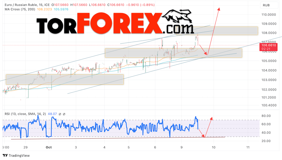 Дополнительным сигнальном в пользу роста валютной пары EUR/RUB на Форекс выступит тест линии линии поддержки на индикаторе относительной силы (RSI). Вторым сигналом станет отскок от нижней границы бычьего канала. Отменой варианта роста валютной пары EUR/RUB на Форекс 10 октября 2023 станет падение и пробой уровня 104.45 Евро за Рубль. Это укажет на пробой области поддержки и продолжение падения пары Евро Рубль в область ниже уровня 100.65. Подтверждением росту валютной пары выступит пробой области сопротивления и закрытие котировок инструмента выше уровня 108.65, что укажет на пробой верхней границы бычьего канала, а это сигнал к росту на ширину канала.