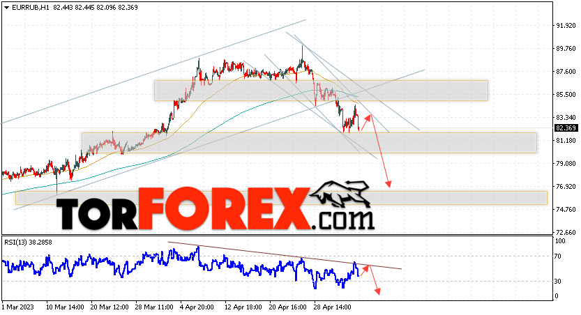 Дополнительным сигнальном в пользу сопротивления валютной пары EUR/RUB на Форекс выступит тест линии линии сопротивления на индикаторе относительной силы (RSI). Вторым сигналом станет отскок от верхней границы нисходящего канала. Отменой варианта падения валютной пары EUR/RUB на Форекс 11 мая 2023 станет сильный рост и пробой уровня 85.75 Евро за Рубль. Это укажет на пробой области сопротивления и продолжение роста пары Евро Рубль в область выше уровня 90.05. Подтверждением падению валютной пары выступит пробой области поддержки и закрытие котировок инструмента ниже уровня 80.35.