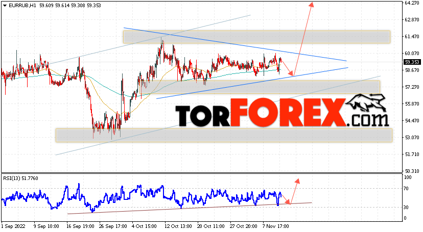 Дополнительным сигнальном в пользу подъёма валютной пары EUR/RUB на Форекс выступит тест линии линии поддержки на индикаторе относительной силы (RSI). Вторым сигналом станет отскок от нижней границы модели ”Треугольник”. Отменой варианта роста валютной пары EUR/RUB на Форекс 11 ноября 2022 станет падение и пробой уровня 55.85 Евро за Рубль. Это укажет на пробой области поддержки и продолжение снижения пары Евро Рубль в область ниже уровня 52.45. Подтверждением росту валютной пары выступит пробой области сопротивления и закрытие котировок инструмента выше уровня 61.35, что укажет на пробой верхней границы модели ”Треугольник” и начало отработки паттерна с целью вверху.