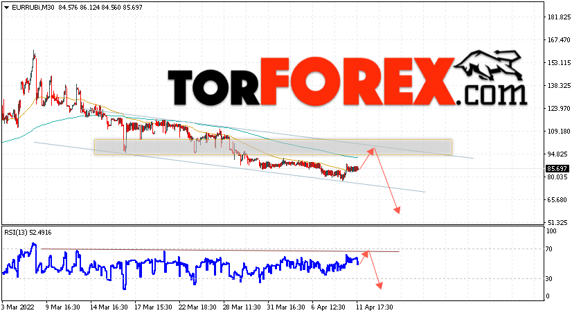 Дополнительным сигнальном в пользу падения валютной пары EUR/RUB на Форекс выступит тест линии сопротивления на индикаторе относительной силы (RSI). Вторым сигналом станет отскок от верхней границы нисходящего канала. Отменой варианта падения валютной пары EUR/RUB на Форекс 12 апреля 2022 станет сильный рост и пробой уровня 100.55 Евро за Рубль. Это укажет на пробой области сопротивления и продолжение роста пары Евро Рубль в область выше уровня 110.65. Подтверждением падению валютной пары выступит пробой области поддержки и закрытие котировок инструмента под уровнем 75.05.
