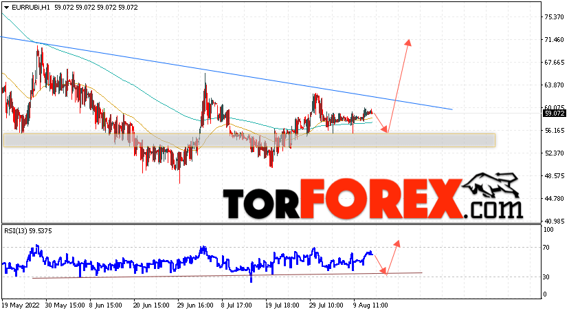 Дополнительным сигнальном в пользу роста валютной пары EUR/RUB на Форекс выступит тест линии линии поддержки на индикаторе относительной силы (RSI). Вторым сигналом станет отскок от нижней границы разворотной модели ”Голова и плечи”. Отменой варианта подъёма валютной пары EUR/RUB на Форекс 12 августа 2022 станет падение и пробой уровня 48.45 Евро за Рубль. Это укажет на пробой области поддержки и продолжение падения пары Евро Рубль в область ниже уровня 42.05. Подтверждением росту валютной пары выступит пробой области сопротивления и закрытие котировок инструмента выше уровня 64.45, что укажет на завершение формирования разворотной модели ”Голова и плечи” и начало отработки паттерна.