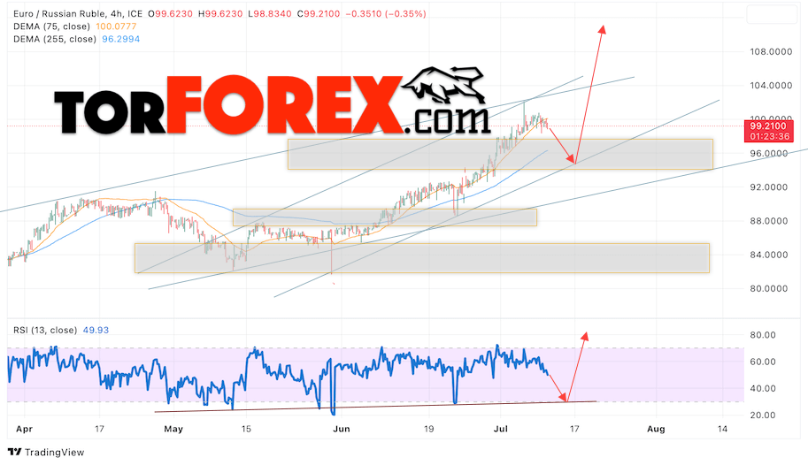Дополнительным сигнальном в пользу подъёма валютной пары EUR/RUB на Форекс выступит тест линии линии поддержки на индикаторе относительной силы (RSI). Вторым сигналом станет отскок от нижней границы бычьего канала. Отменой варианта роста валютной пары EUR/RUB на Форекс 12 июля 2023 станет падение и пробой уровня 91.05 Евро за Рубль. Это укажет на пробой области поддержки и продолжение падения пары Евро Рубль в область ниже уровня 86.55. Подтверждением росту валютной пары выступит пробой области сопротивления и закрытие котировок инструмента выше уровня 105.55, что укажет на пробой верхней границы бычьего канала.