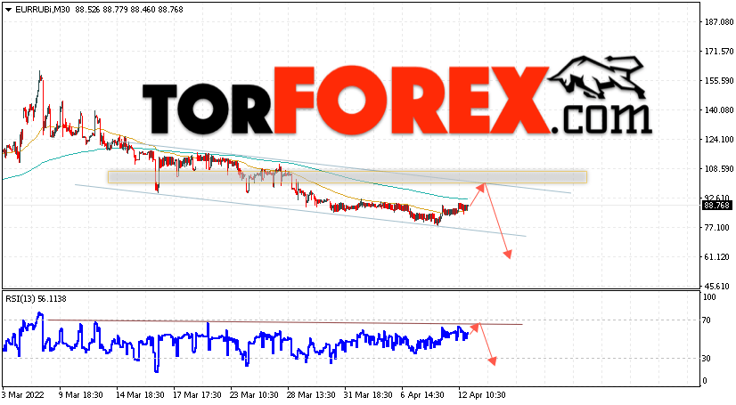 Дополнительным сигнальном в пользу падения валютной пары EUR/RUB на Форекс выступит тест линии сопротивления на индикаторе относительной силы (RSI). Вторым сигналом станет отскок от верхней границы нисходящего канала. Отменой варианта падения валютной пары EUR/RUB на Форекс 13 апреля 2022 станет сильный рост и пробой уровня 105.05 Евро за Рубль. Это укажет на пробой области сопротивления и продолжение роста пары Евро Рубль в область выше уровня 115.05. Подтверждением падению валютной пары выступит пробой области поддержки и закрытие котировок инструмента под уровнем 75.05.